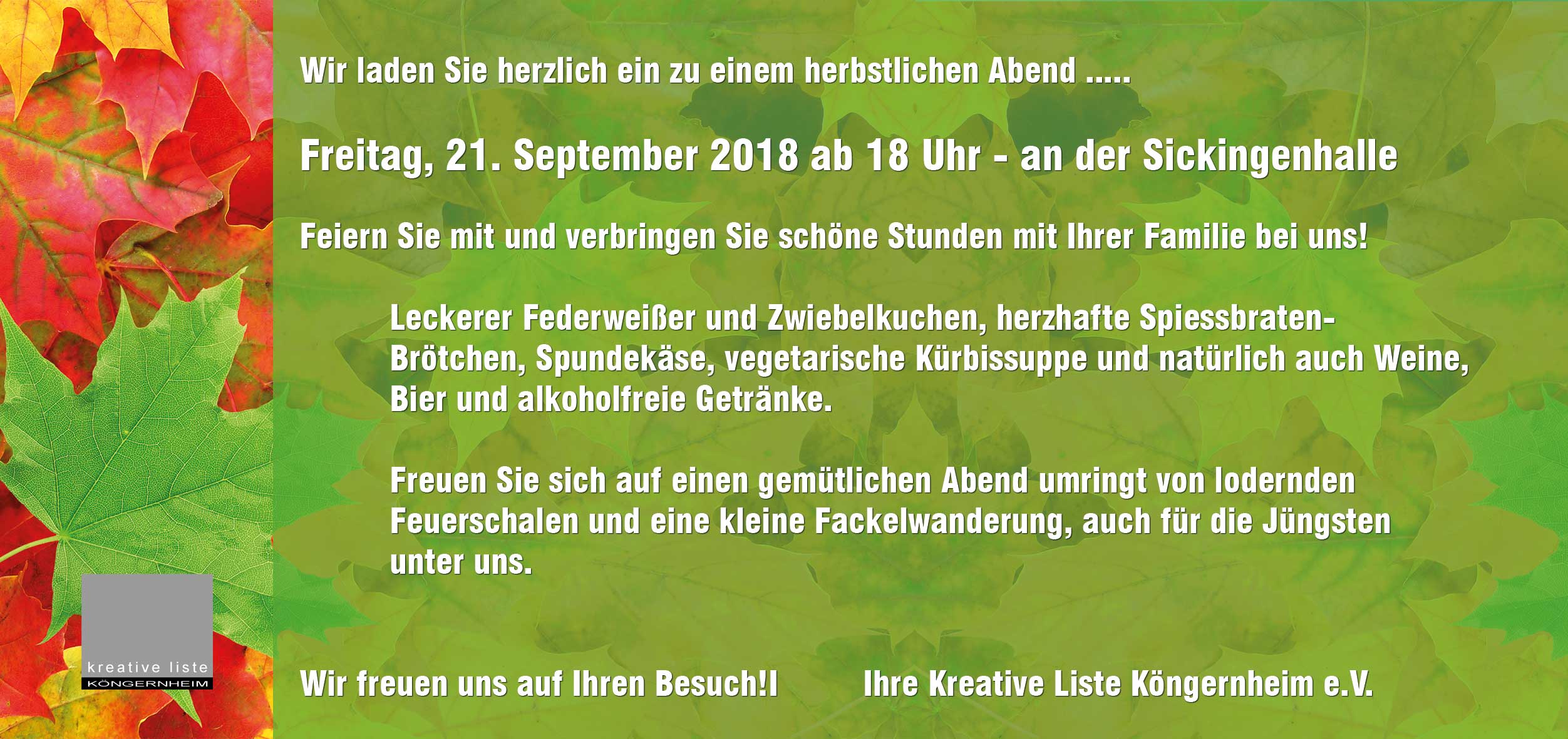Nachdem es letztes Jahr leider nicht stattfinden konnte, laden wir Sie herzlich zu einem herbstlichen Abend, am Freitag, 24. September 2021 ab 18 Uhr an der Sickingenhalle ein. Feiern Sie mit und verbringen Sie schöne Stunden mit Ihrer Familie bei uns!